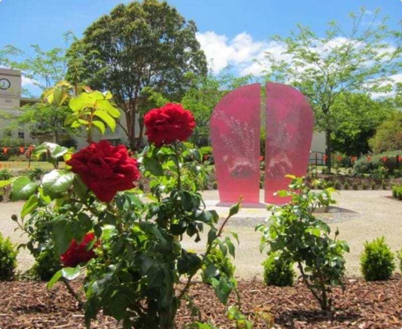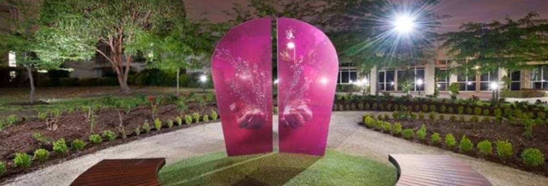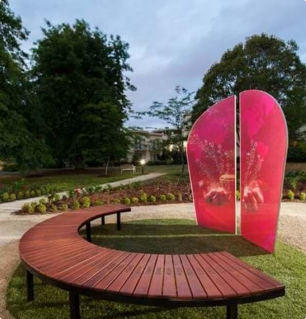 Feature glass petals stand colorful and a powerful story of the past residence of this once hostel. Led lighting illuminate the petals to create a wow factor at night. Curved seating curved around the petals. Synthetic grass and a new rose named after garden create spring/summer and autumn color with yellow daffodils giving a meadow of color in winter. Hundreds of Dutch buxus frame the teardrop shaped garden.