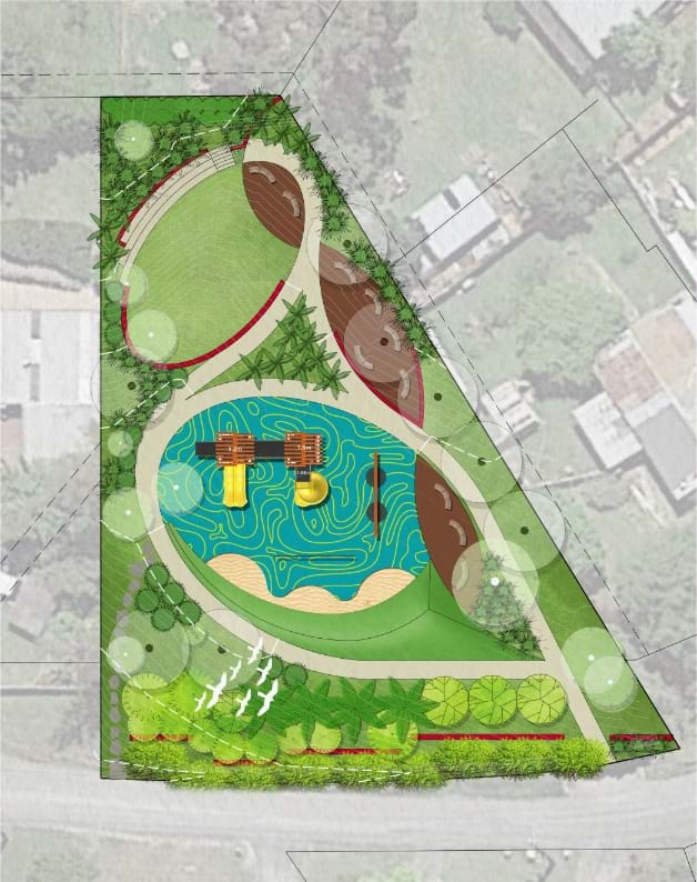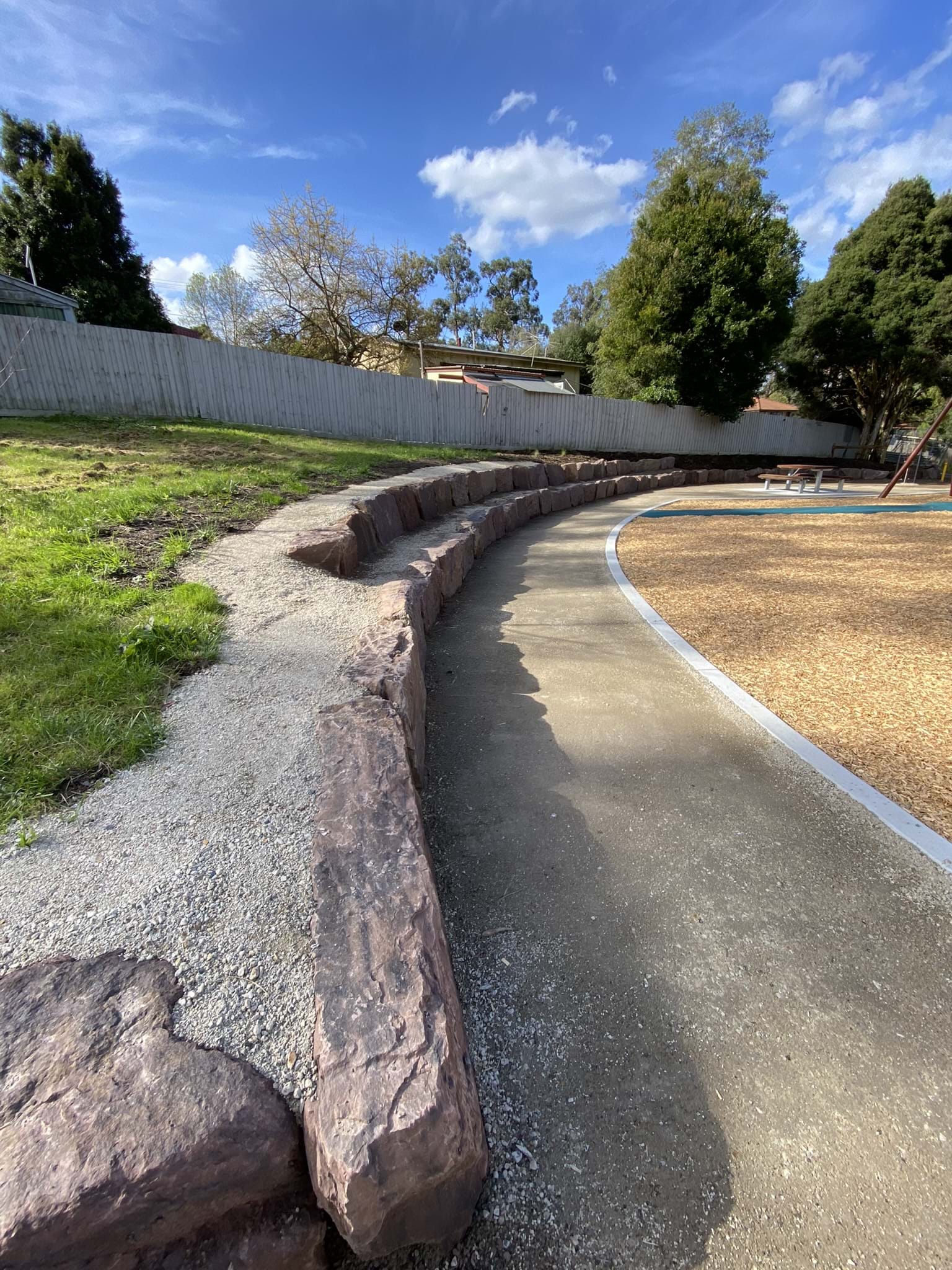 The design addresses level differences and drainage requirements of the site through the gradual slope of pathways, low height retaining walls, mudstones and mounds. These elements ensures the safety between green pockets with steep level difference while also ensuring the interesting play of landscape.