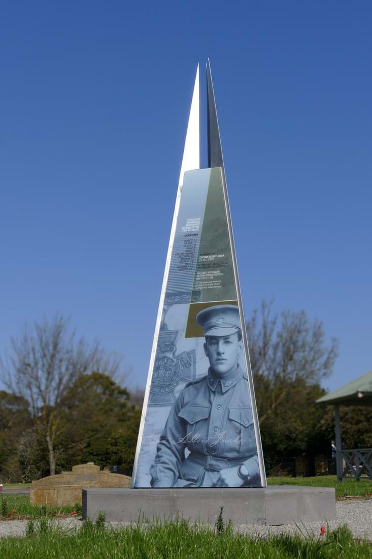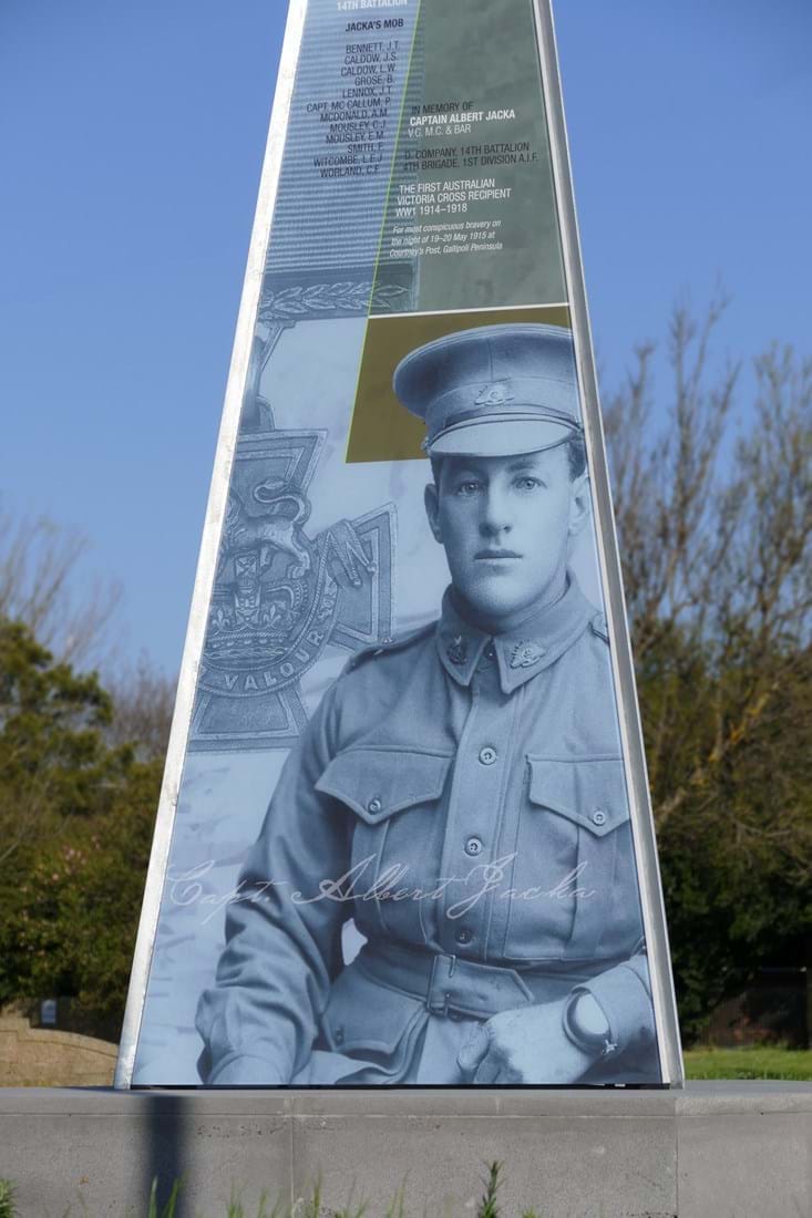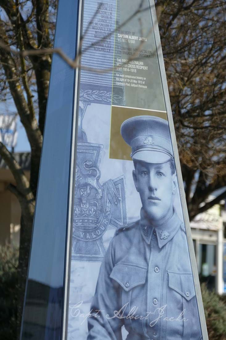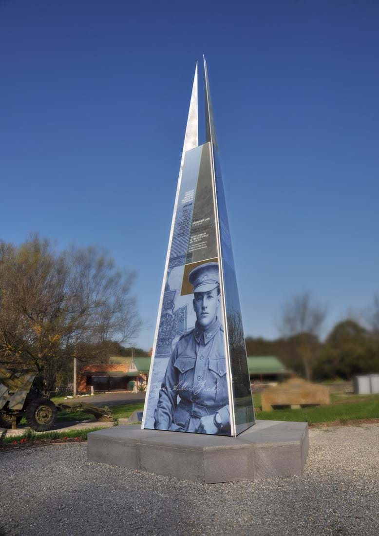 The three triangular shape printed glass art panels honour the current Victoria cross recipients of Australia, Local Victoria cross recipient Albert Jacka VC those who served in Boer war,World war 1,World war 2, Korean war, Vietnam war and peacekeepers.