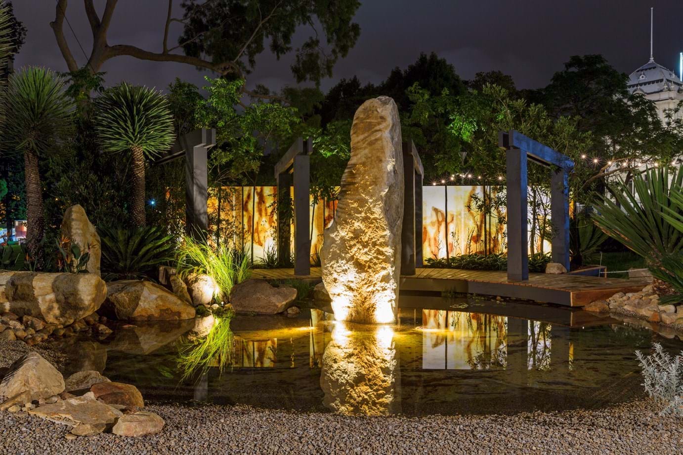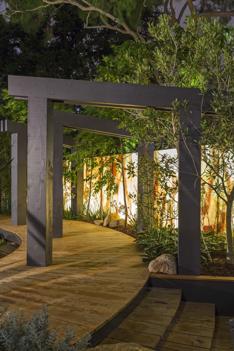 The cooling misting unit also provides a visual element to the landscape as well as cooling the space during hot weather. Sound in the landscape adds to the atmosphere whilst garden light creates a whole different mood and look to the landscape at night. The rear of the garden is formalized with an interporation of landscape printed on to a glass art panel which frames the show gardens backdrop.