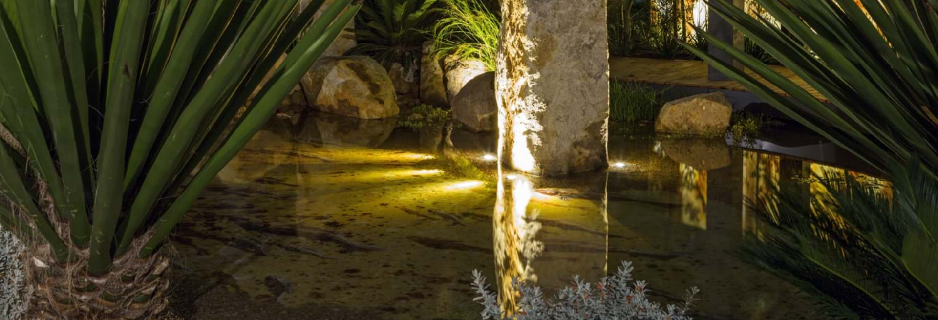 Our design is representative of a landscape that focuses on the centrally placed yellow granite boulder. The design line radiates out from the centre of the boulder to the indigenous glass art panels set within the water of the circular pond, semi circular deck and pergola providing relaxation place of visual interest Australian native and exotic planting set amongst these elements giving an arid planting feel to the outer perimeter of the landscape and merging into a more tropical lagoon planting theme closer to the water body.