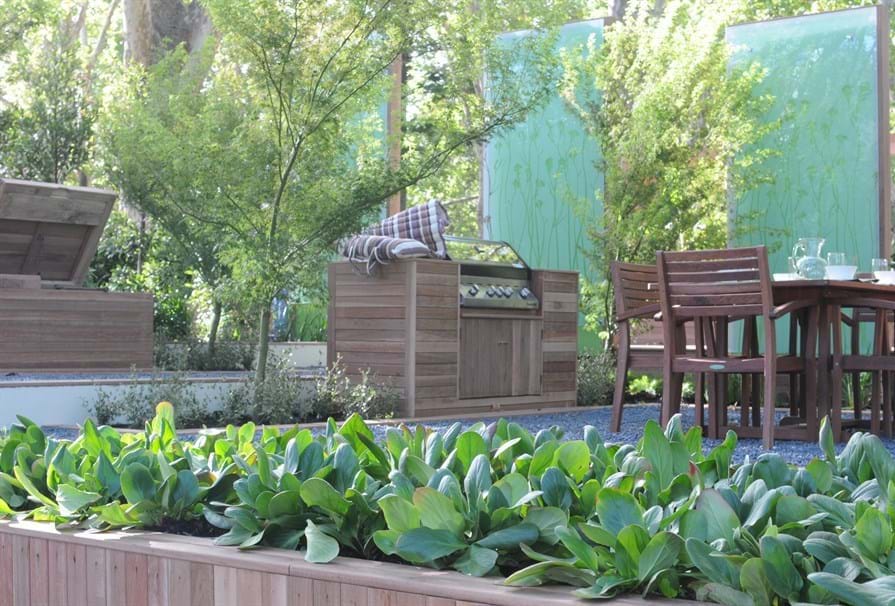 This garden demonstrates the potential to adopt a range of sustainable practices without sacrificing style, functionality or formal looks. The garden includes a tank to supply the fish pond stocked with native fish and to irrigate the garden. A storage box and worm farm for recycling kitchen scraps is hidden inside a day bed while on the lower deck a BBQ is concealed in a similar way.