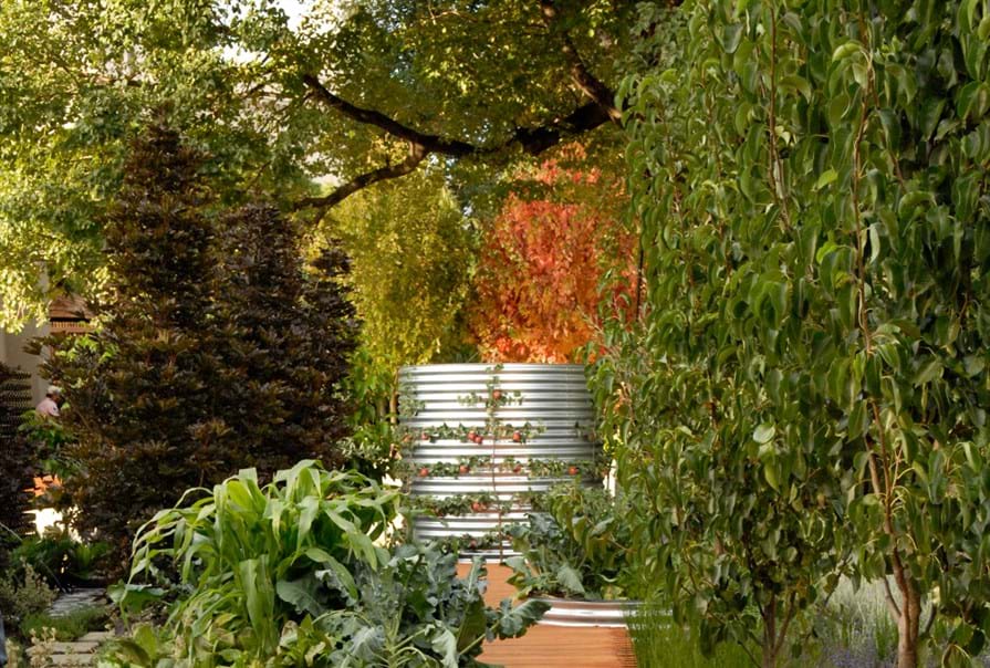 'Food for Thought' is an edible garden inspired by the pre-renaissance practice of combining food plants with ornamental plants as well as today's environmental challenges. The design is intended to appeal to environmentally conscious consumers, DIY types and children alike. The garden includes a used wine bottle wall, sustainable permeable paving made from resin bonded recycled crushed glass, an aquaponic system, a worm farm and on site water harvesting, storage and distribution via a permeable pavement, water tank and drip irrigation. Hardy ornamental plants adapted to Australia’s harsh climate, herbs and vegetable and fruit and shade trees make up the plant palette.