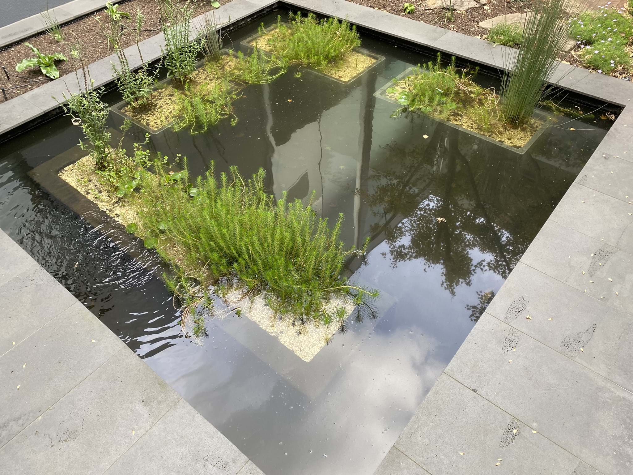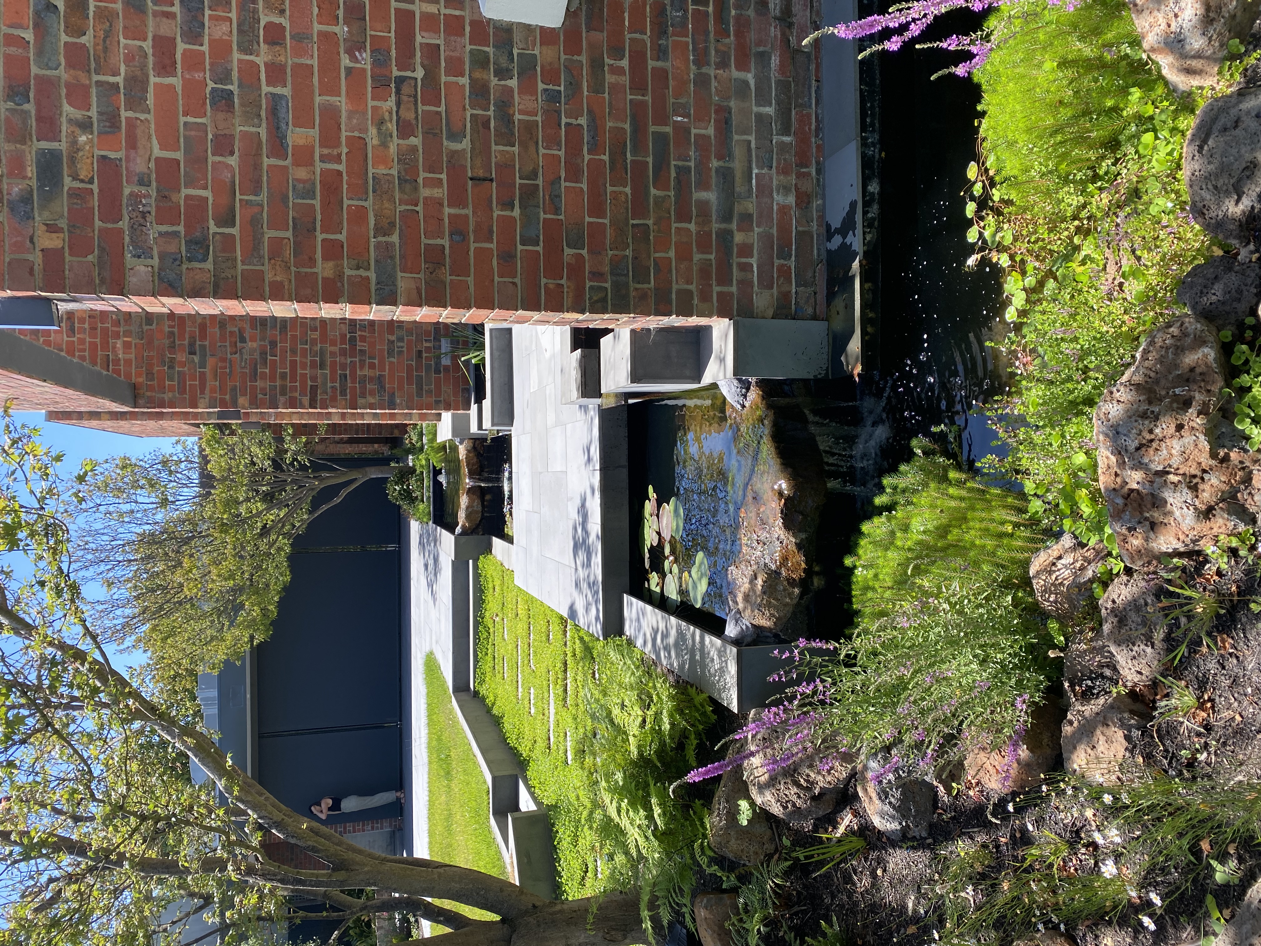 The silver birch walk creates a link from the dwelling street entry and to the rear garden rooms with existing silver birch trees remaining and providing an established look and the signature textured white colour bark you admire as passing. The understory green foliage plants including ferns and the like is a create understory cover that leads to the water garden theme.