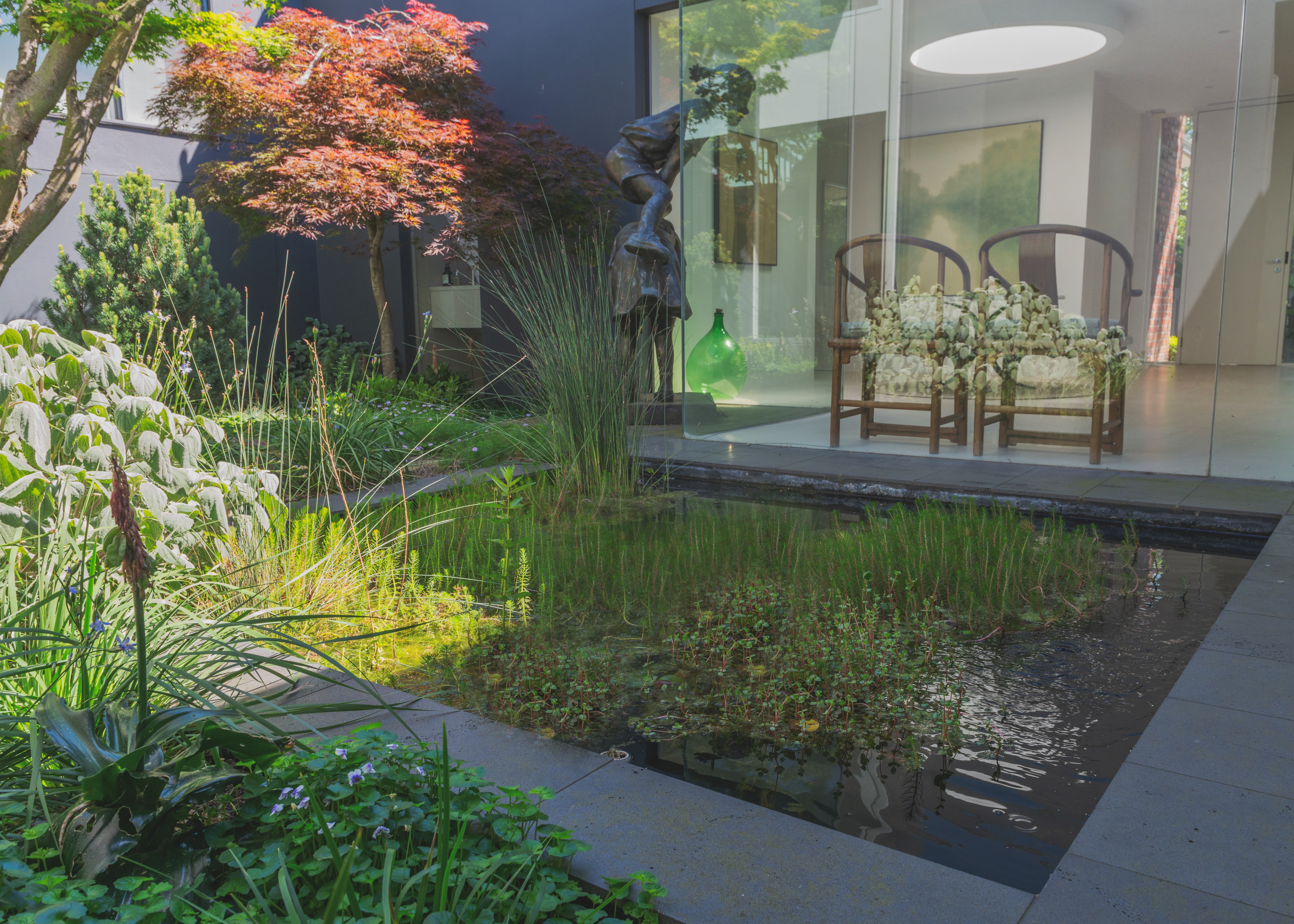 The fifth garden room is an internal courtyard flanked on three sides by wall-to-ceiling glass, providing spacious views from the kitchen and access hallways. There is a front entry into the courtyard garden, which features a pond filled with aquatic plants, a world-renowned sculpture by Brom, and Japanese-inspired plantings and stonework. A tranquil ambiance is created at night through strategically placed garden lighting.