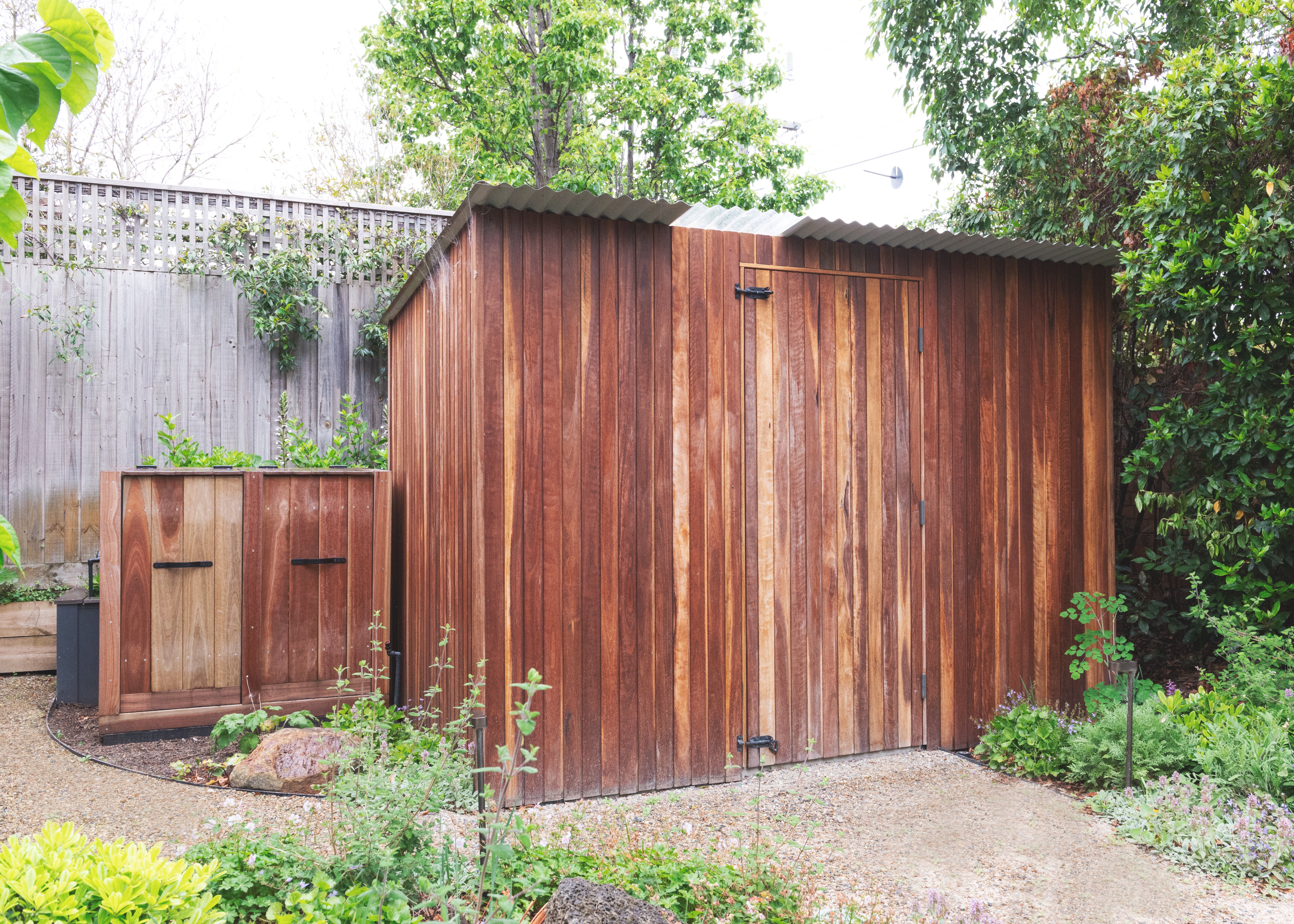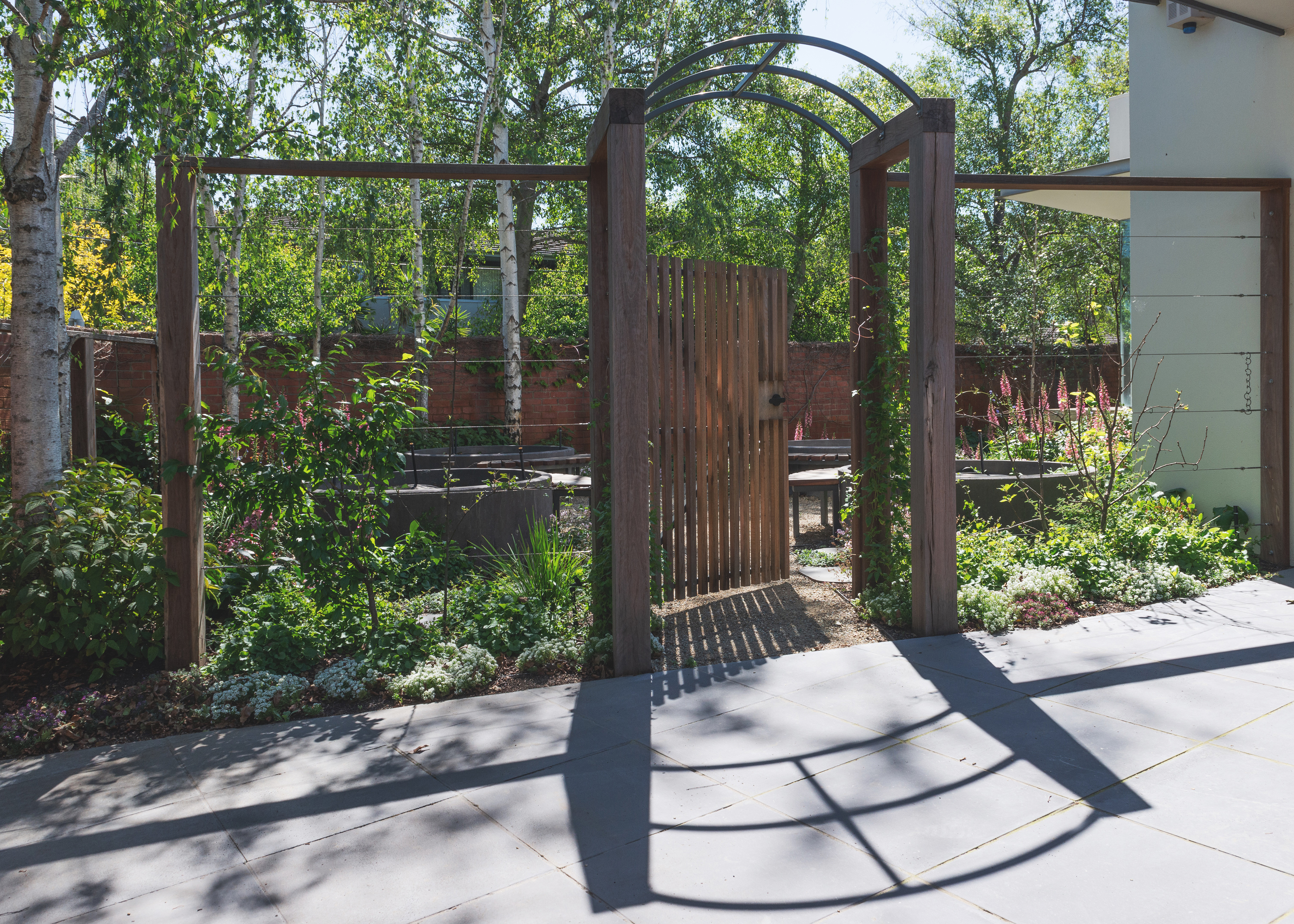 Garden Room Four is a productive garden that creates a private space for seating to admire the mixed planting palette with the productive plants such as herbs, vegetable and espaliered fruit trees. An ornate fence and arbour gate leads you to this garden from the rear utilities space that is equipped with custom design and built garden shed timber compost bins feature screen to disguise the bins and garden surround.