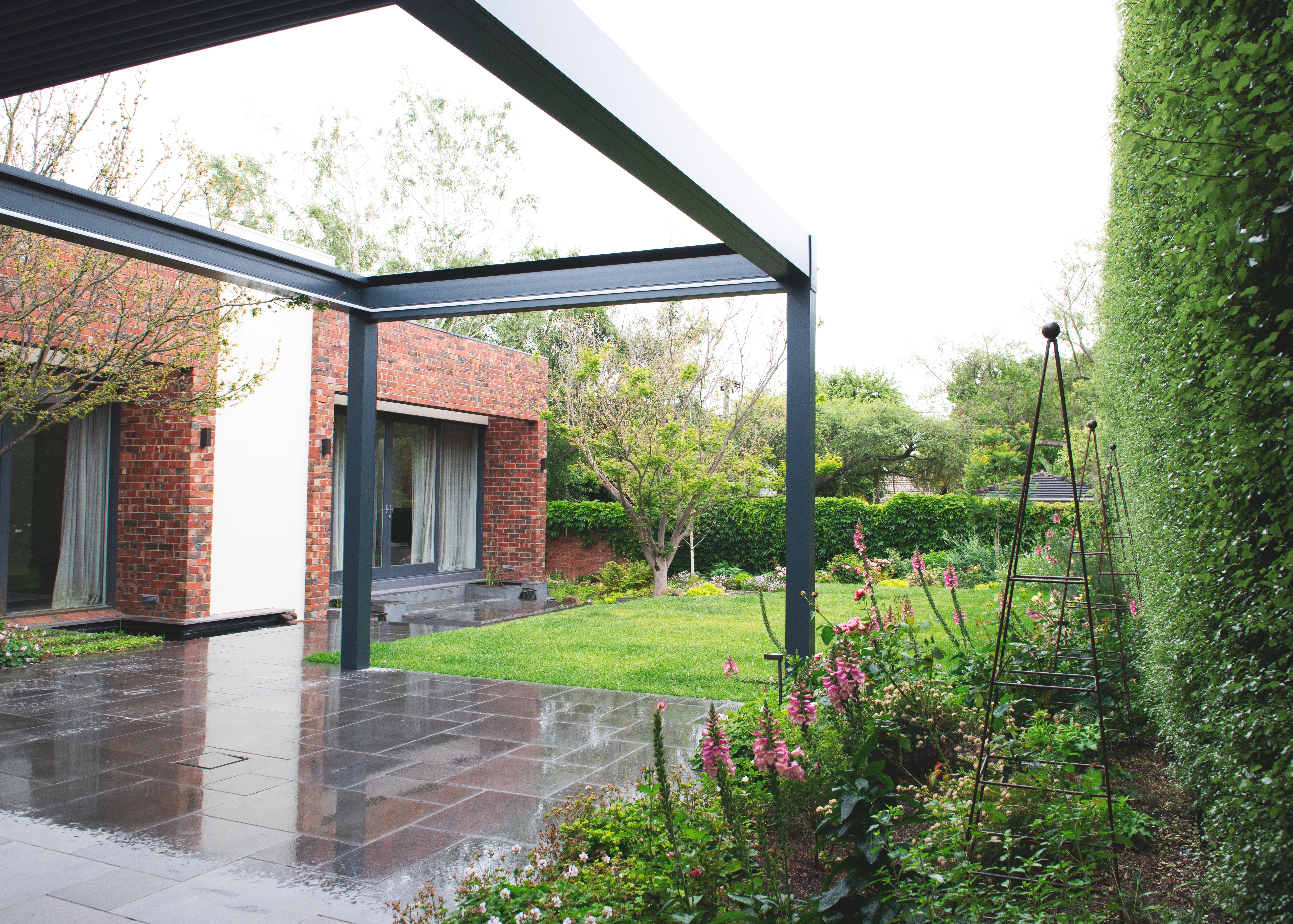 The third garden room features an outdoor lawn terrace surrounded by an exotic and perennial garden. This green and calming space is ideal for play as well as stretching out and relaxing on the lush grass. Traditional plantings of roses, foxgloves, Japanese windflowers and other seasonal flowers create a colourful landscape. The exotic and perennial flora provides consistent visual interest alongside bursts of colours that change with the seasons.