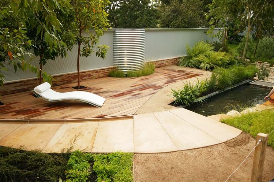 Escape is a break away from the traditional Australian garden. The garden is inspired by the sustainable use of water. This water theme is expressed visually through the stone channel, dry creek bed and the water tank. The dry creek bed also acts as a water filter, as it passes through semi aquatic planting. The diverse use of water across the site combines into one central pond. The source of the water flowing down the stone rill is derived from stormwater stored in the water tank. The tank as a central element in the garden also questions our aesthetic perceptions of decoration; that sustainable design elements can also have an aesthetic value.