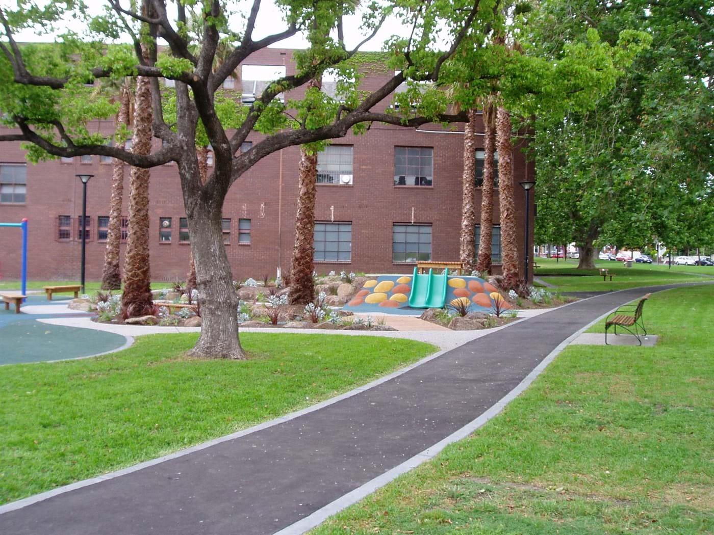 A technique landscape build from 12 meter high palm tree installations, to specialize rubber impact absorbing surfaces, playground equipment imported from Switzerland and hardy succulent and Mediterranean plants create a fun and colorful play space.