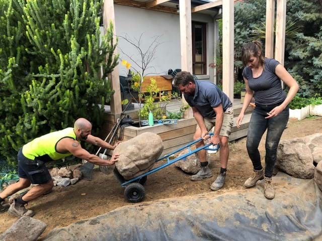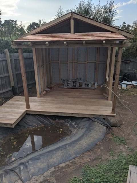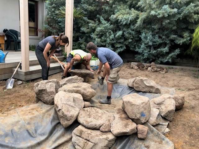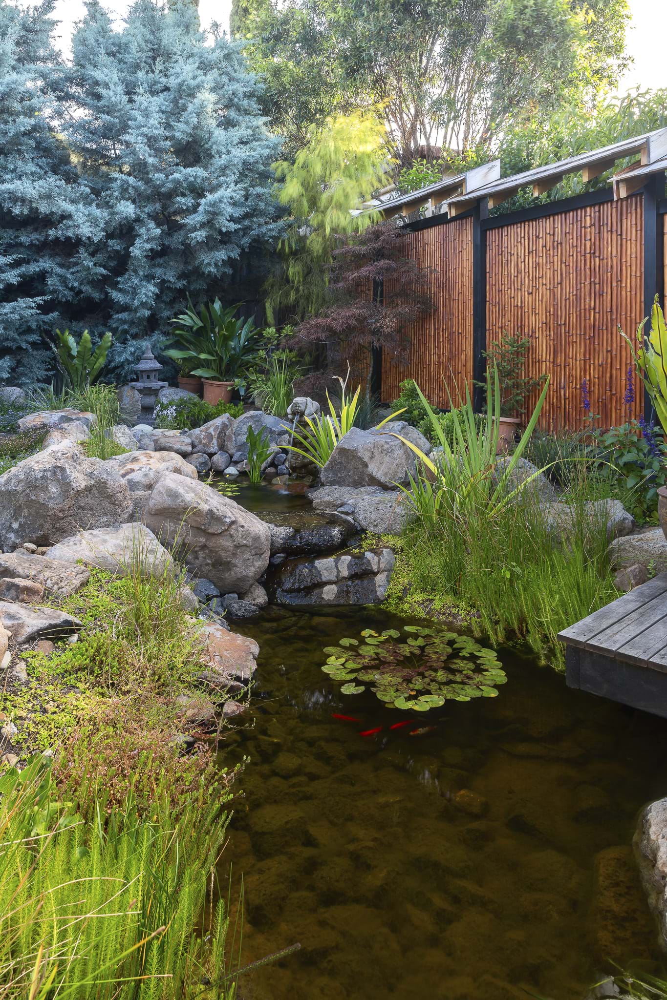 This garden was an uninteresting backyard with a few trees and shrubs and a couchy grass lawn. Which has now been transformed into to a water garden oasis complete with Japanese tea house over hanging a water cascading Australian billabong. Complete with aquatic plants ,fish and ornamental sculptures the garden has transverse into its only little eco system.