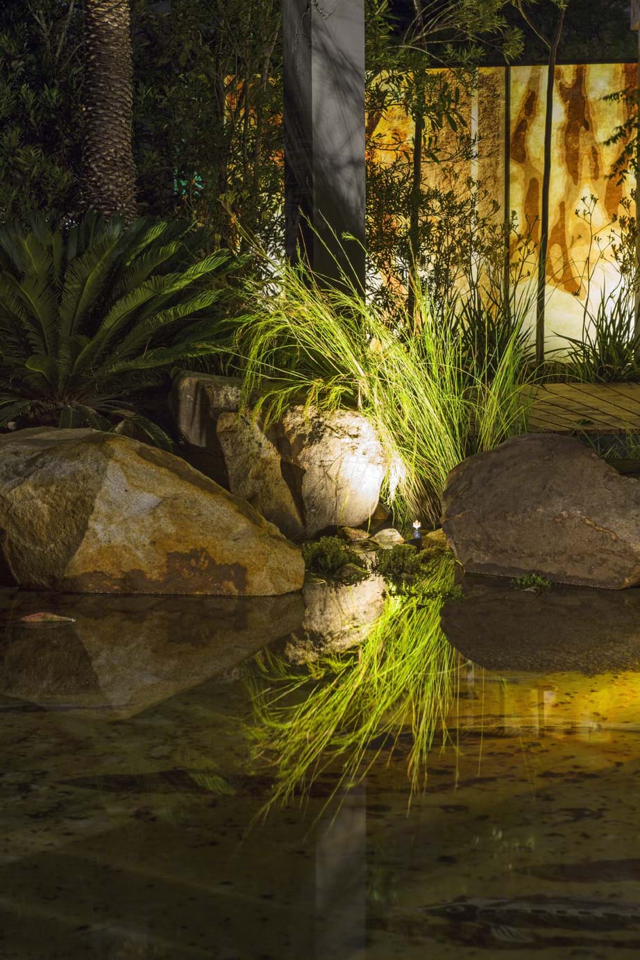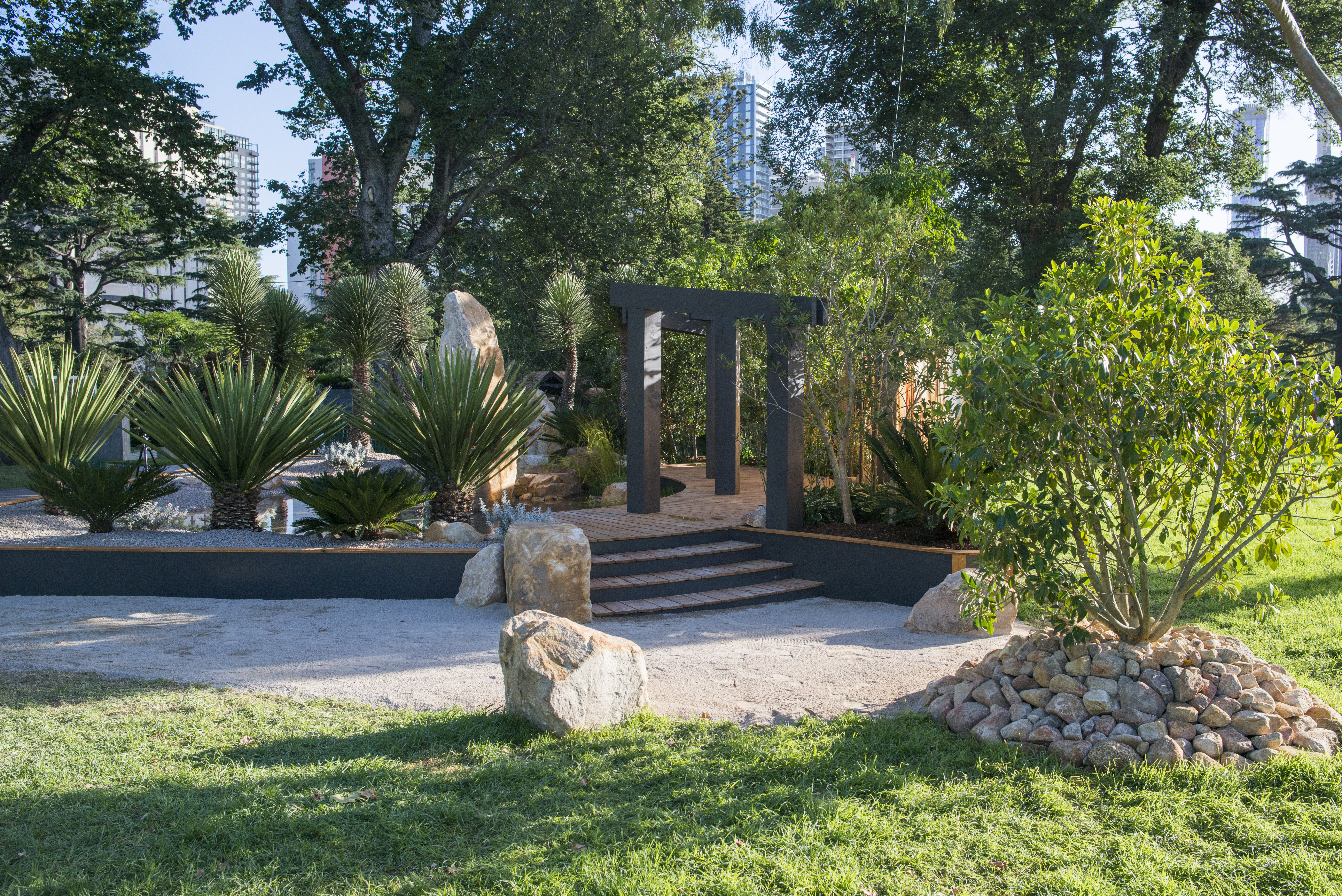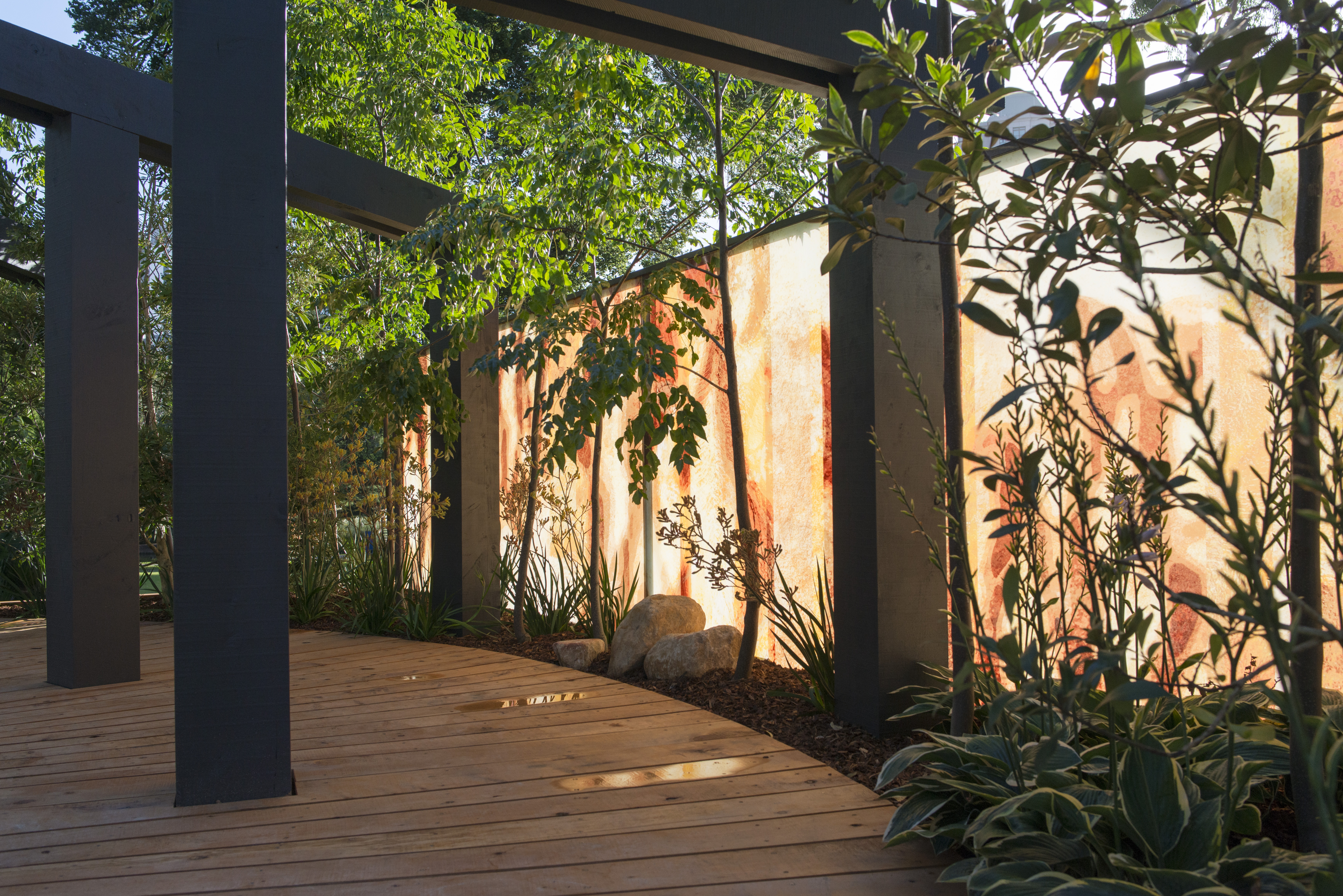 The cooling misting unit also provides a visual element to the landscape as well as cooling the space during hot weather. Sound in the landscape adds to the atmosphere whilst garden light creates a whole different mood and look to the landscape at night. The rear of the garden is formalized with an interporation of landscape printed on to a glass art panel which frames the show gardens backdrop.
