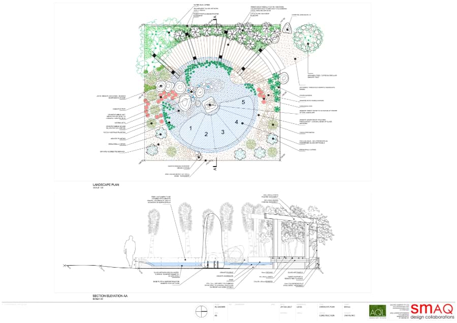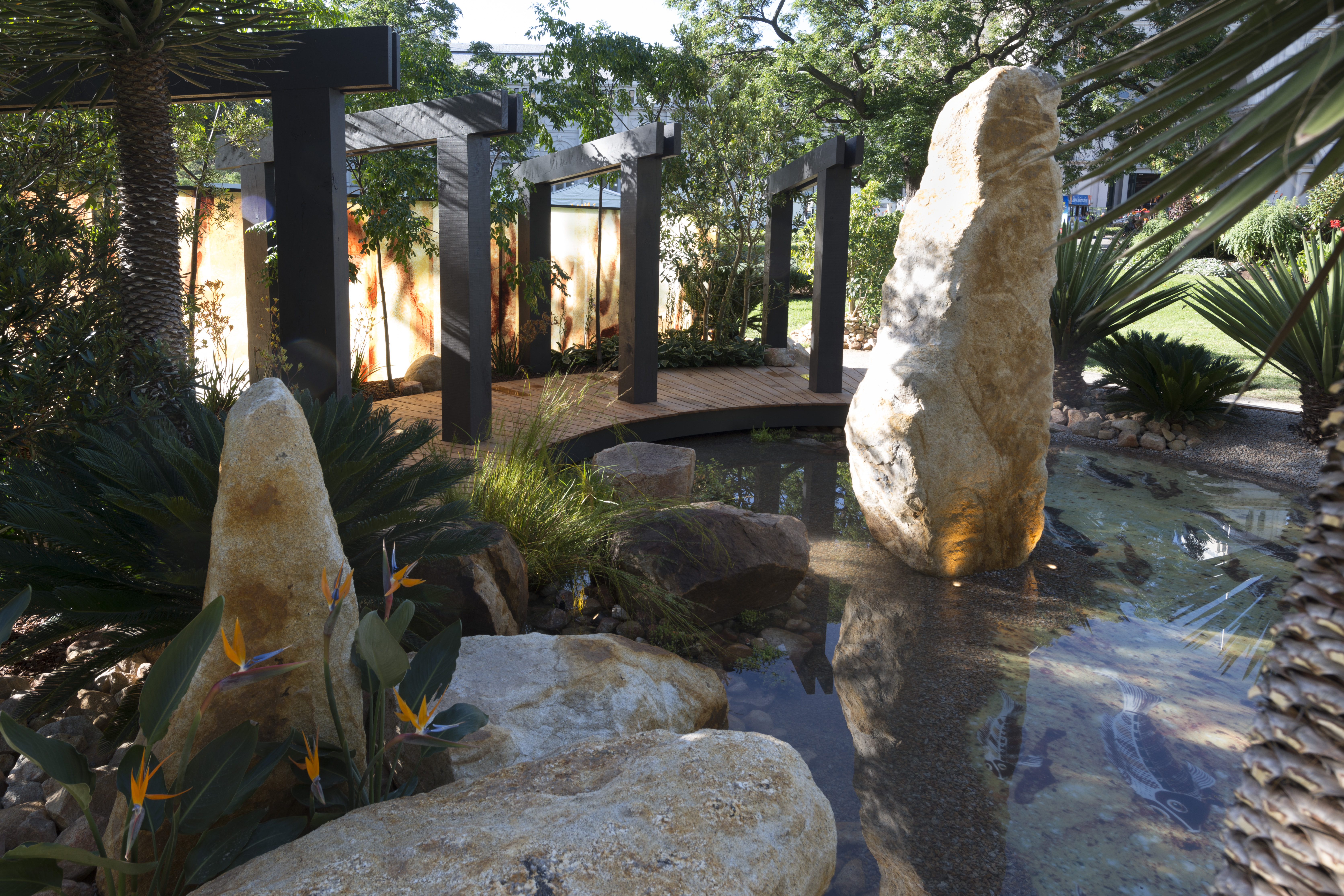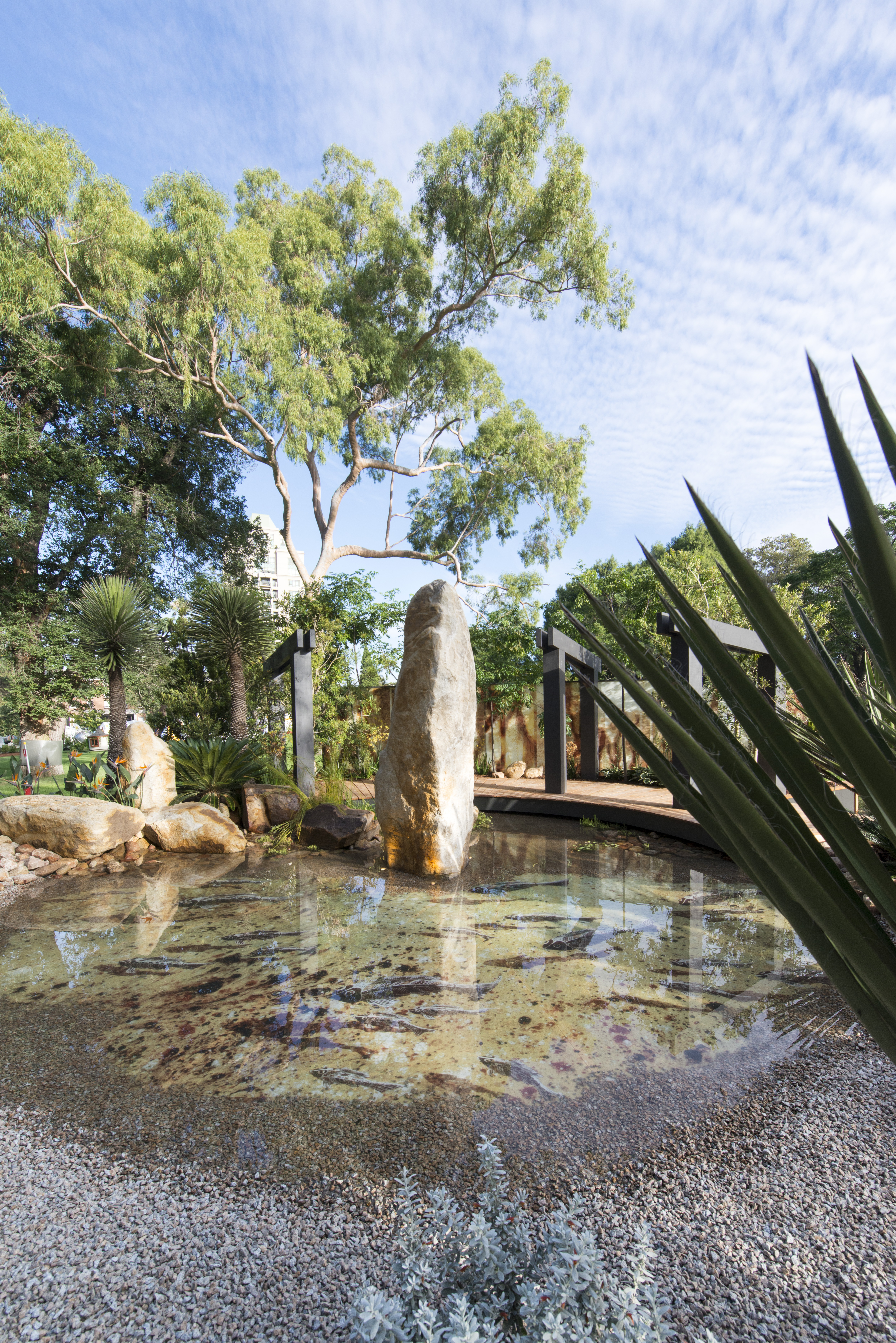 Our design is representative of a landscape that focuses on the centrally placed yellow granite boulder. The design line radiates out from the centre of the boulder to the indigenous glass art panels set within the water of the circular pond, semi circular deck and pergola providing relaxation place of visual interest Australian native and exotic planting set amongst these elements giving an arid planting feel to the outer perimeter of the landscape and merging into a more tropical lagoon planting theme closer to the water body.
