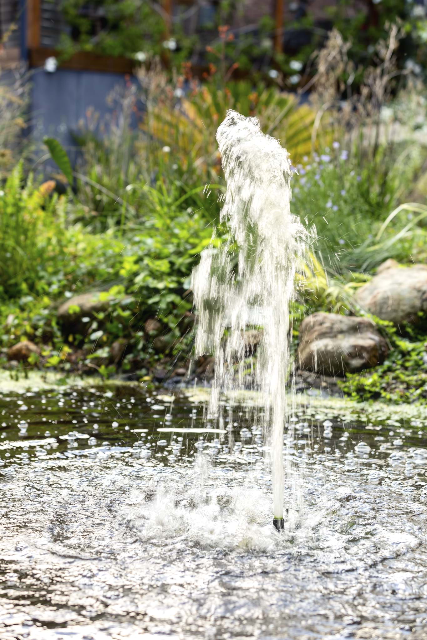 The water pump spouts out a dancing water fountain and the cool water appeal attracts birds, frogs, ducks, dragon flies, lizards and probably many more fauna.