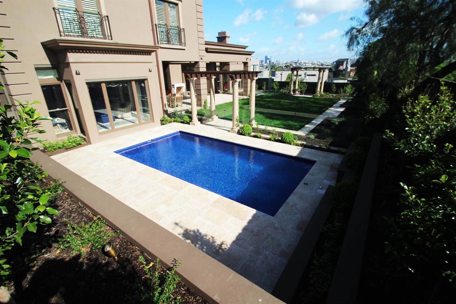 A combination of formal plantings and colourful perennial plants makes a stunning visual appeal for this European style garden. The planting palette complement the ageless appeal of the granite set pavers, bronze water feature with soothing sounds of running water,travertine tiles surrounding the pool deck and alfresco space.