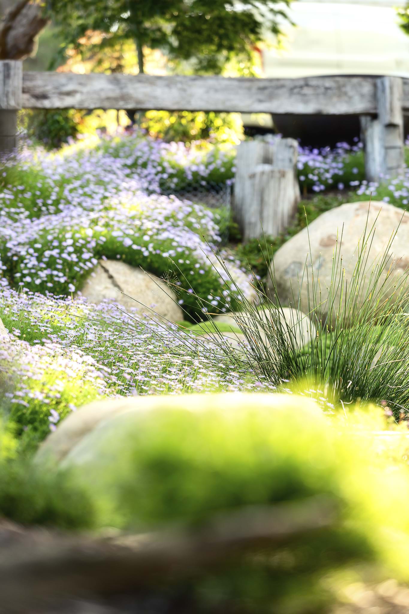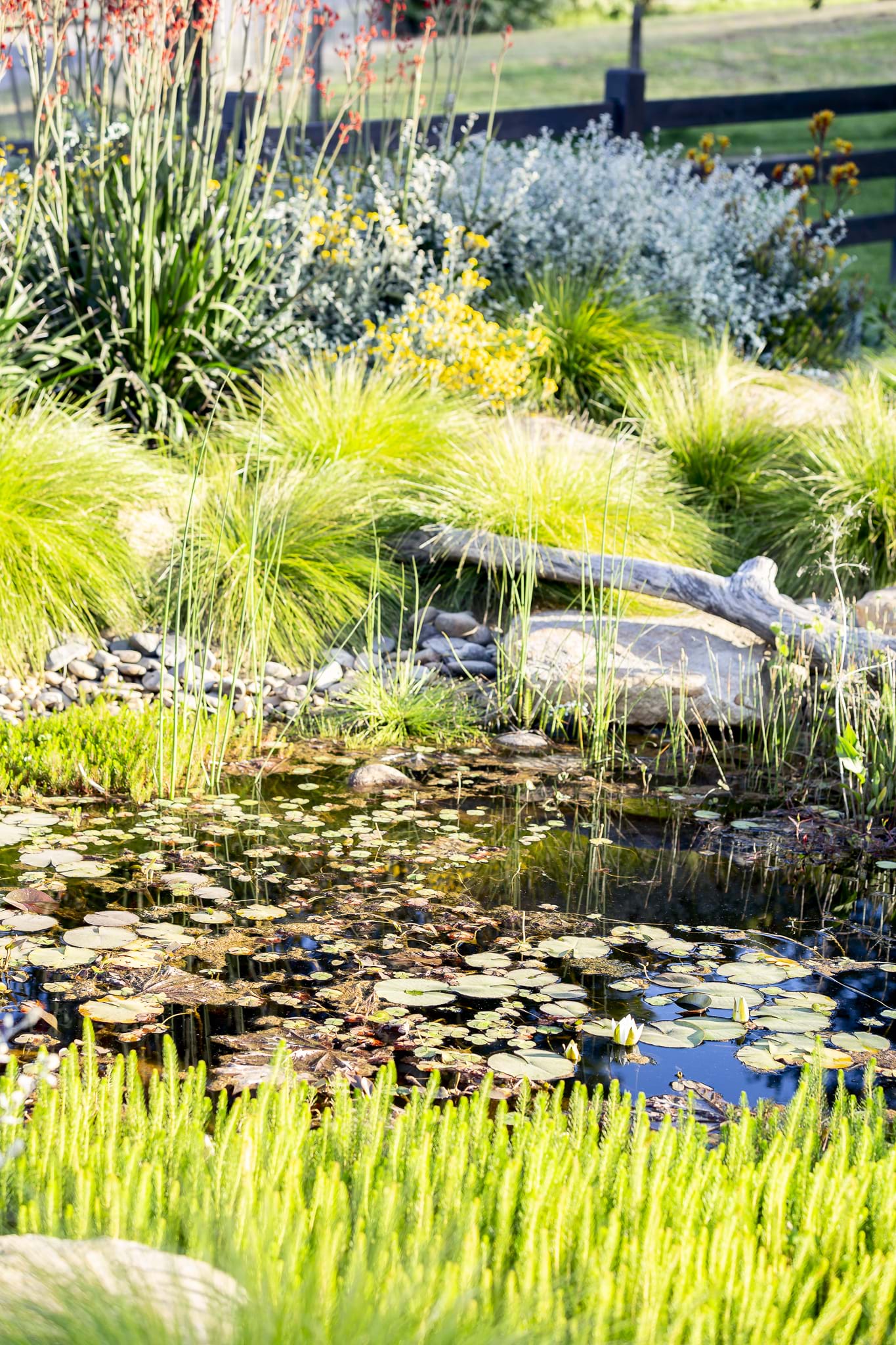 This one part of the garden is a natural flowing creek and billabong gathering water run off from the upper areas of the property and paddocks, the water flows down through the creek filled with semi aquatic plants that look ascetically pleasing, provide a natural area for habitat as well as filter and clean the water. Complete with recycled railway sleeper bridge, large rounded river pebbles, logs and aquatic plants the garden is a wonder view as you enter and exit the property. A popular water hole for local fauna attracting birds, frog’s dragon flyers and may other critters. The rustic garden art provides interest and focal points.