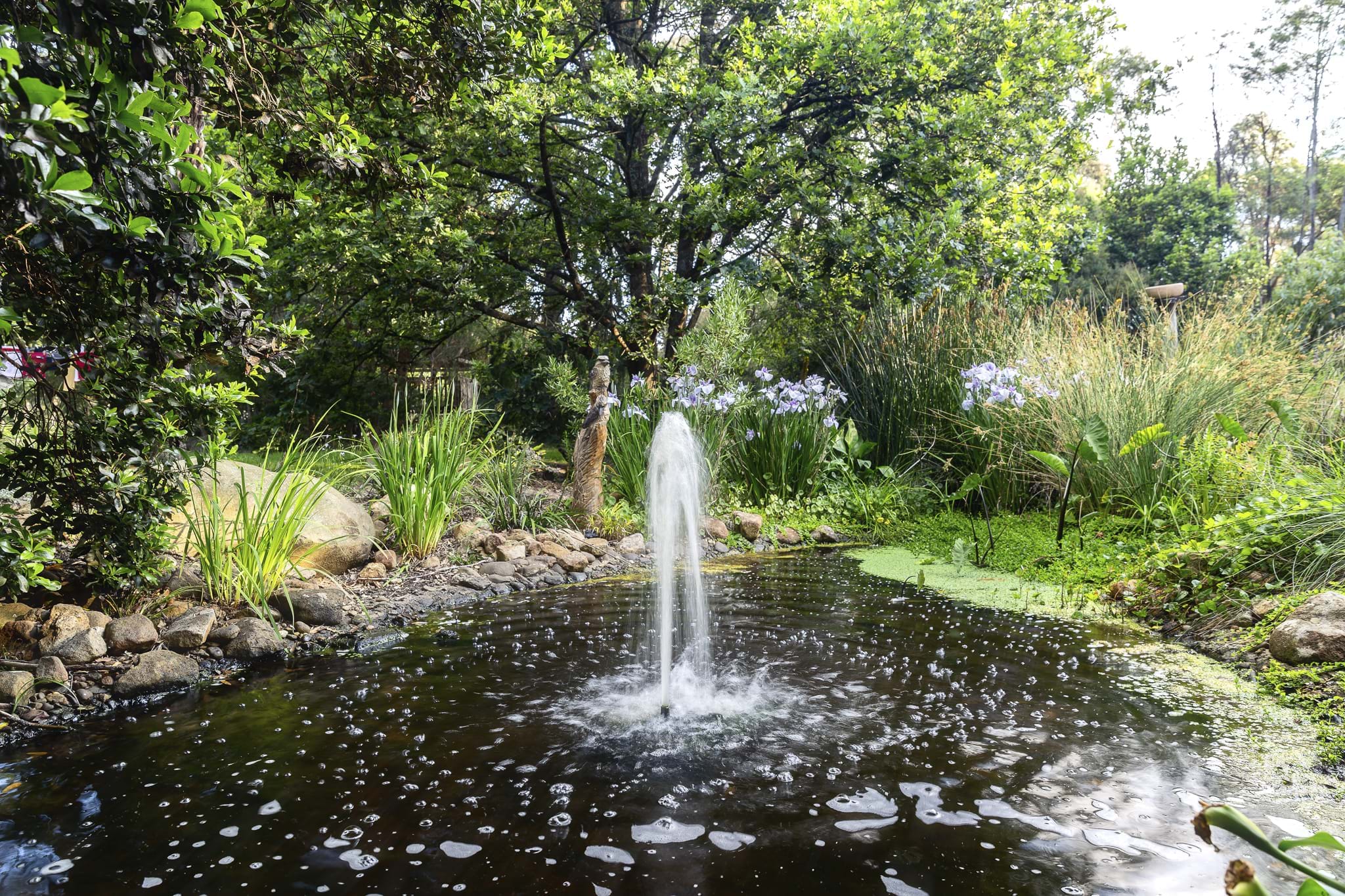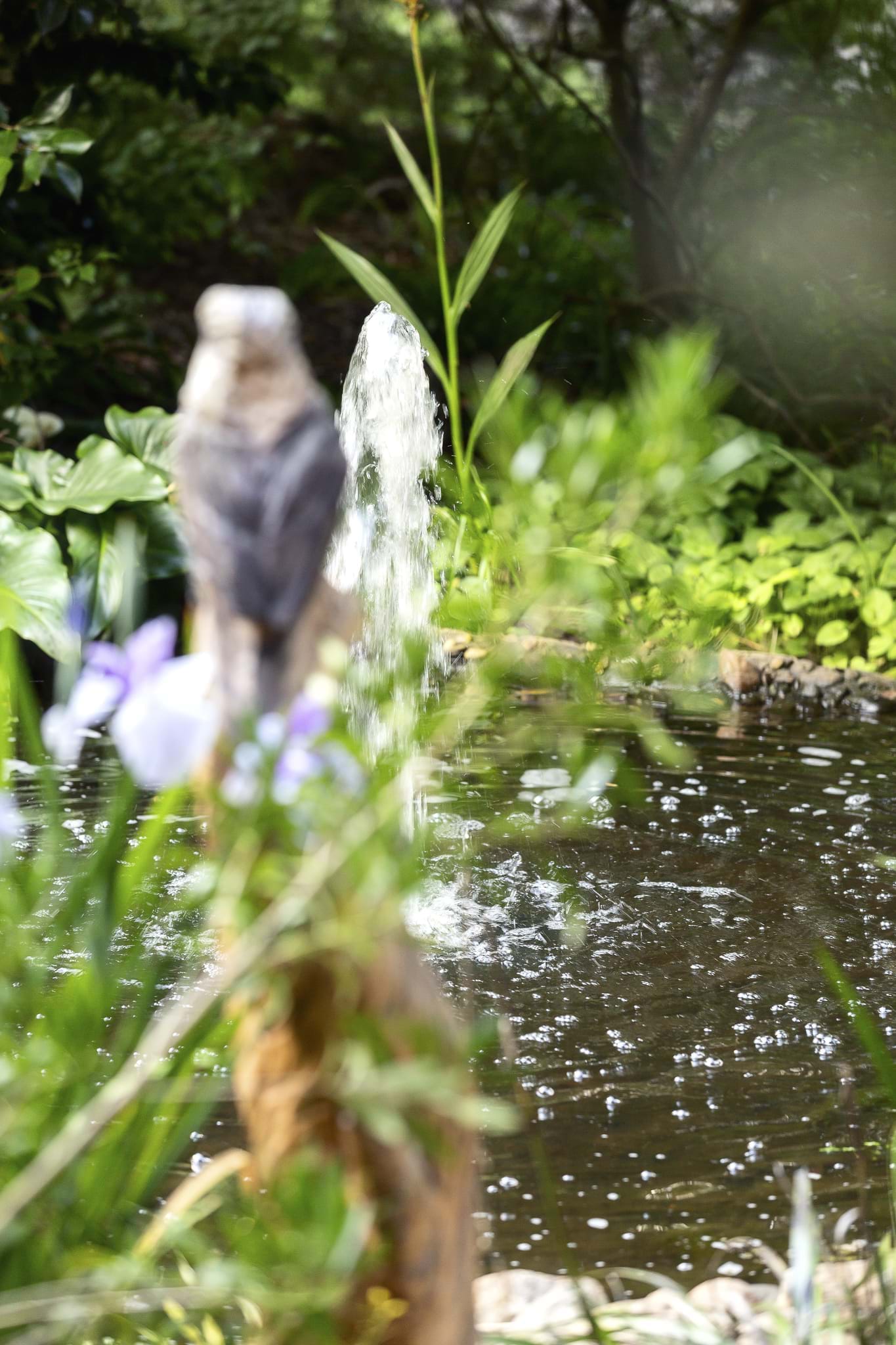 The water pump spouts out a dancing water fountain and the cool water appeal attracts birds, frogs, ducks, dragon flies, lizards and probably many more fauna.