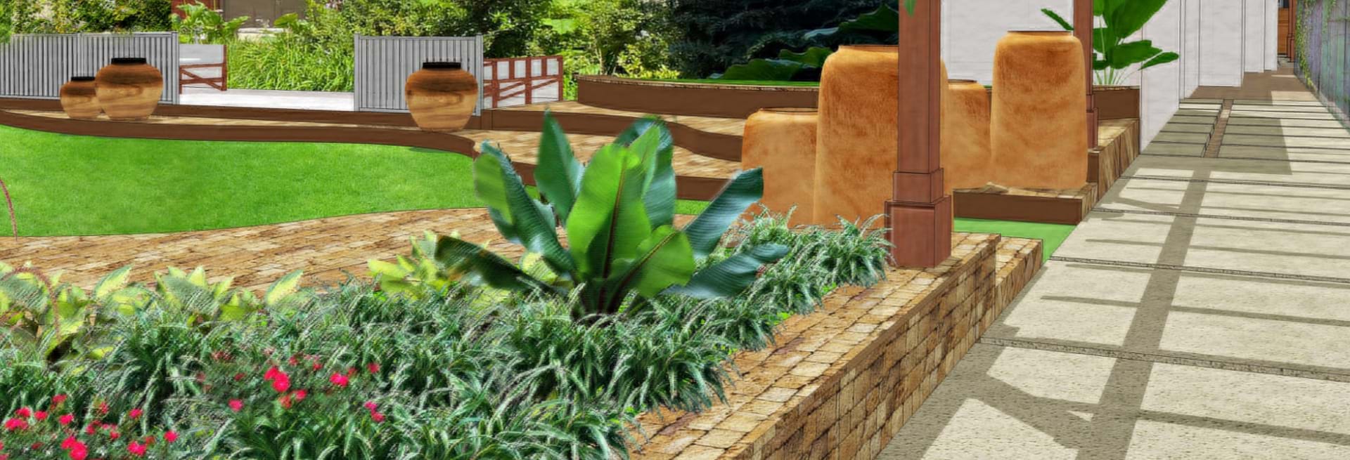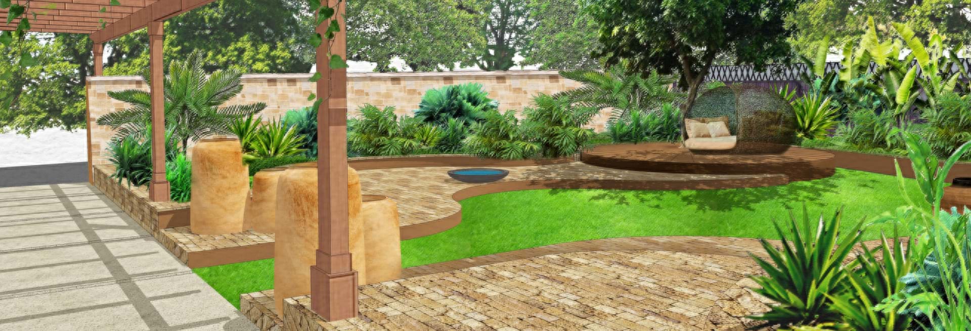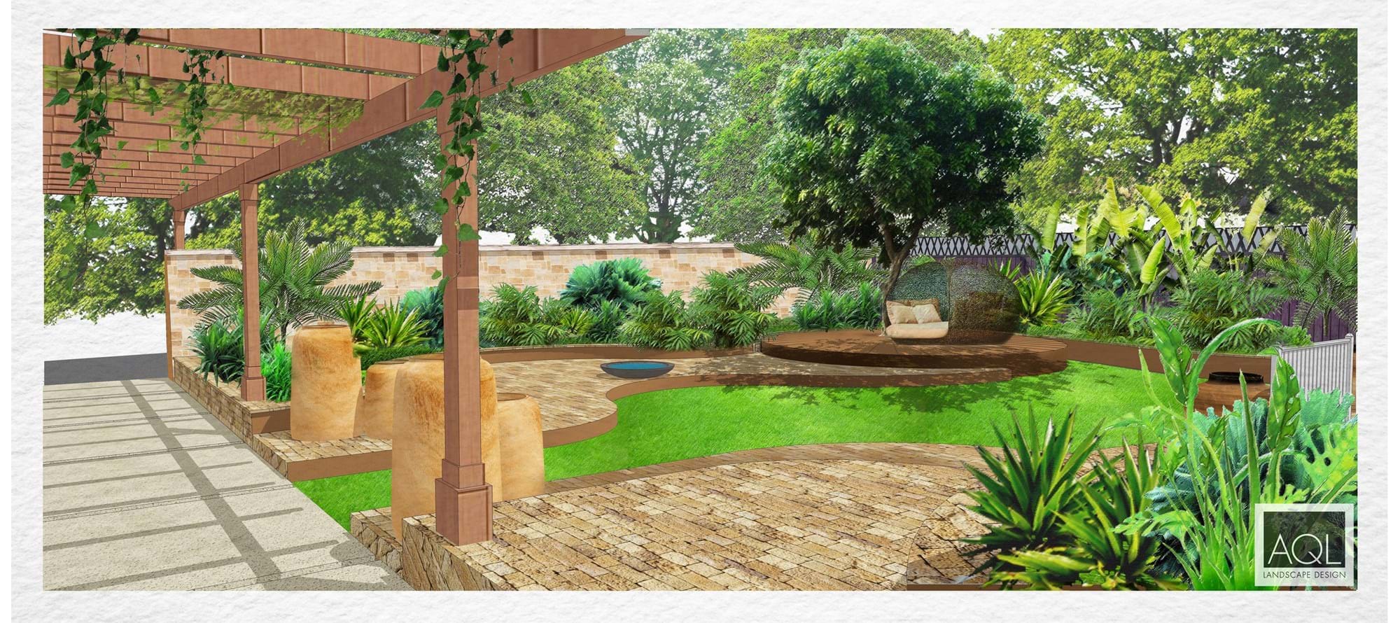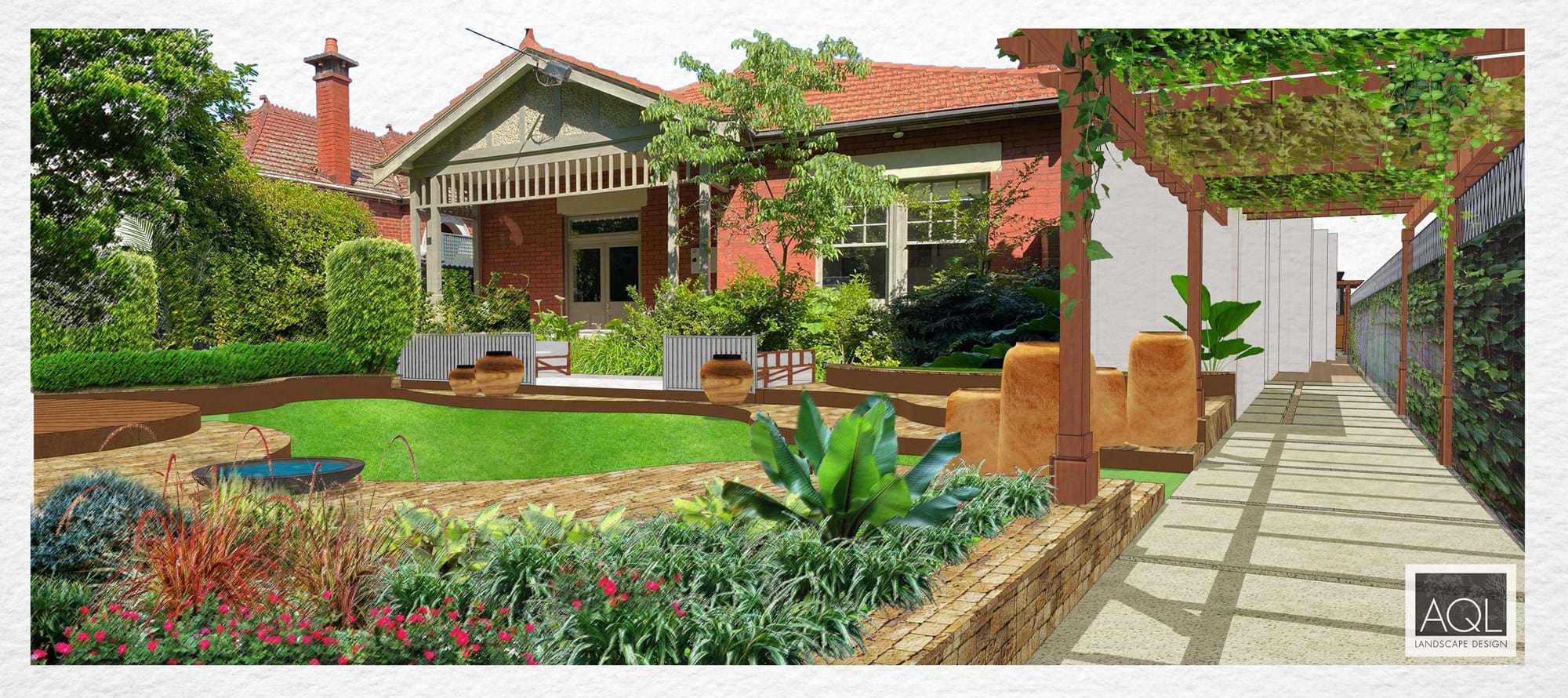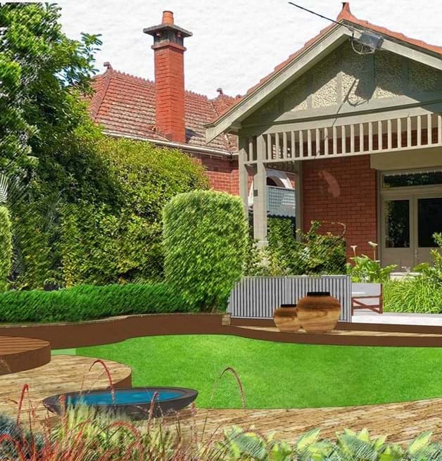 The theming of an organic Australian contemporary garden using stone, steel and timber. These materials are reflecting the Australian environment and encompass the custom designed elements. The realigned pathway entry and covered walkway which will create the design line to parallel to the raised terraced garden, raised pathways meandering through the stone plinths/urns with an Australian native and exotic planting. A concealed storage unit shall also be located. The possibility of water can also be introduced to the space which creates a relaxing and soothing feel.