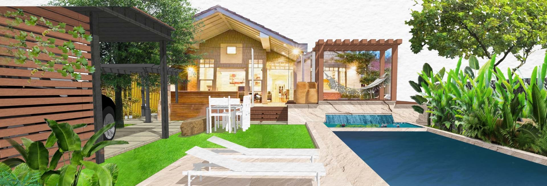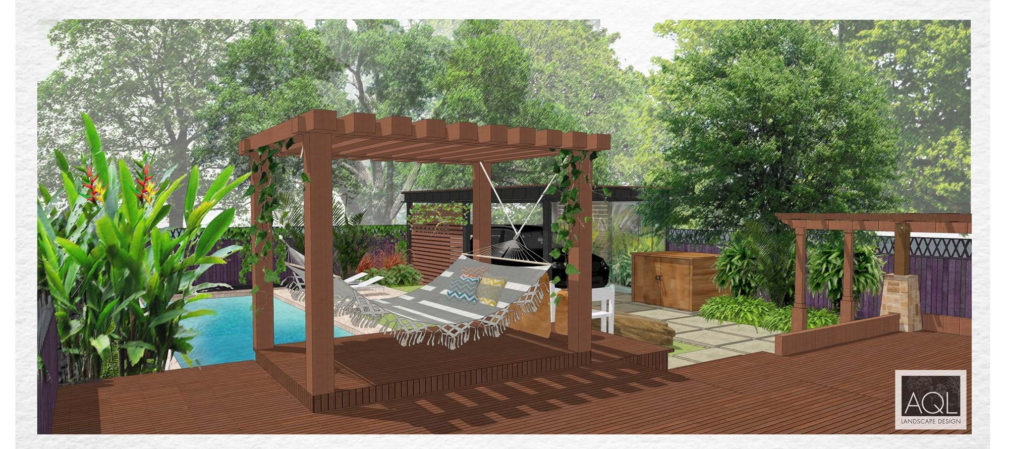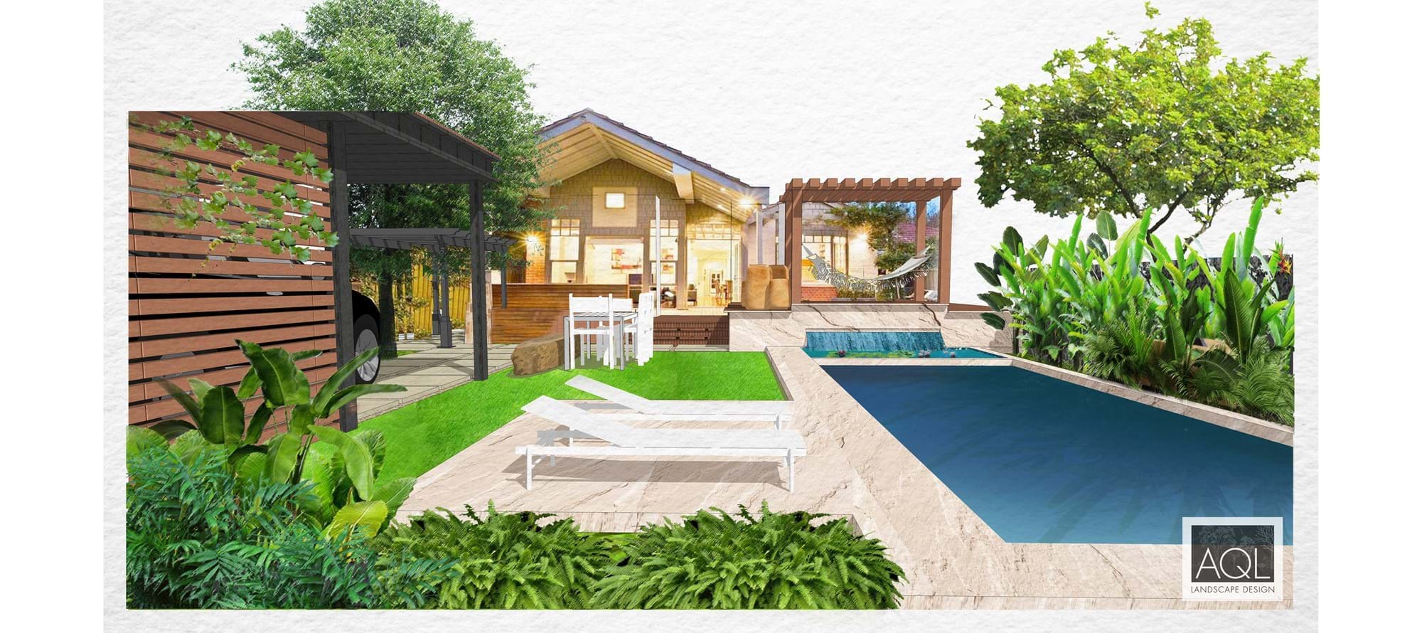 The rear garden features a formalized contemporary design line layout incorporating swimming pool, carport, new garden spaces and synthetic grass area.