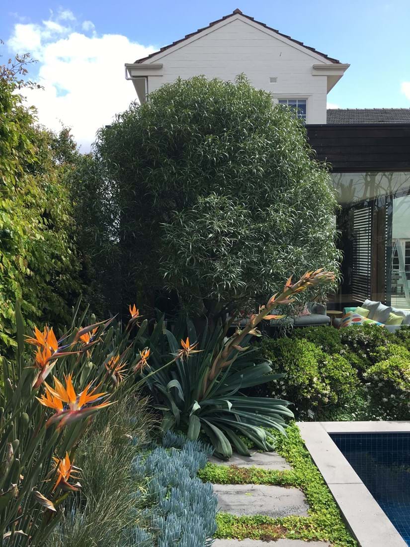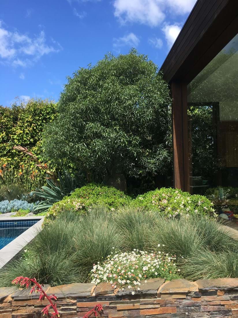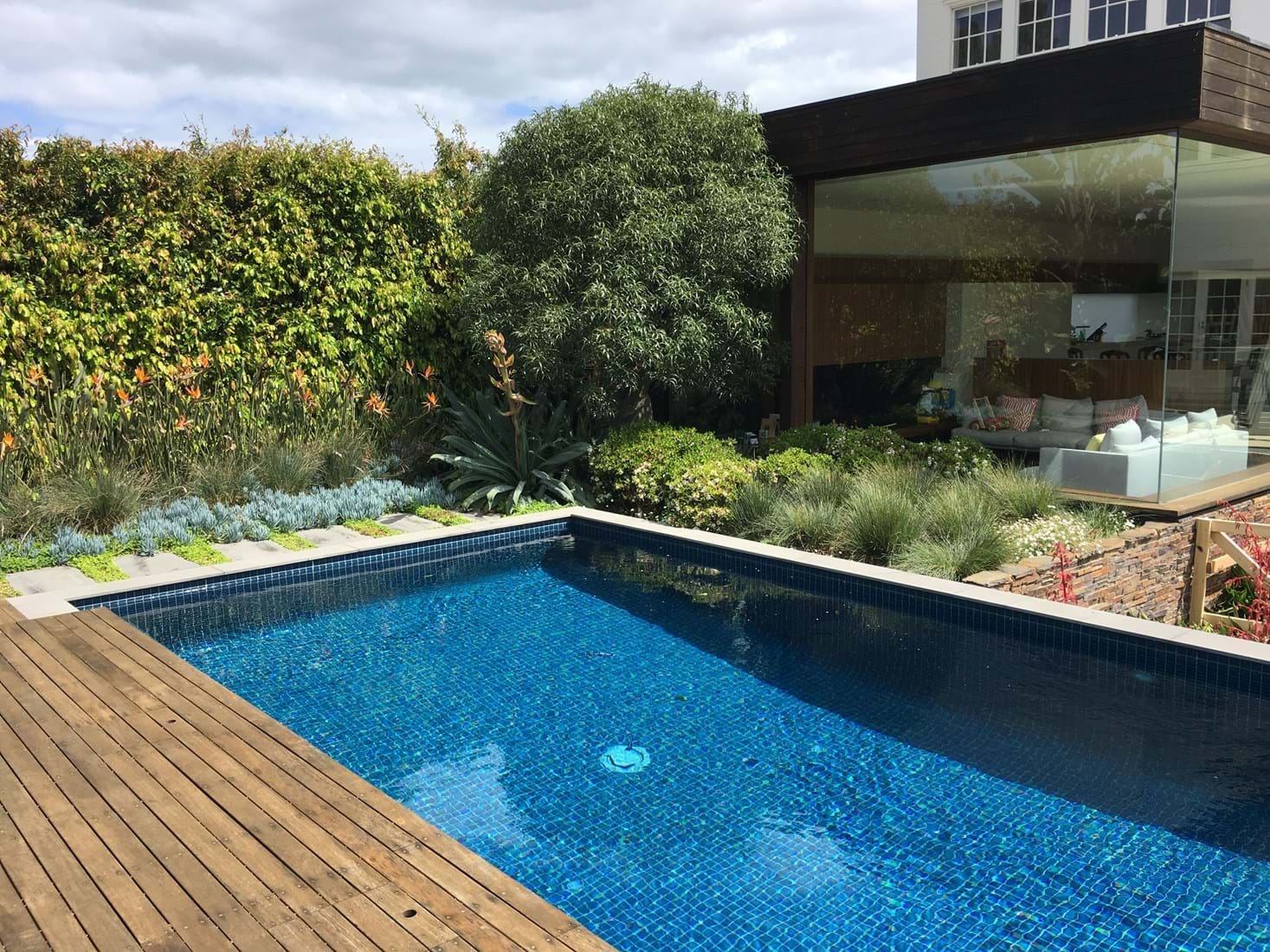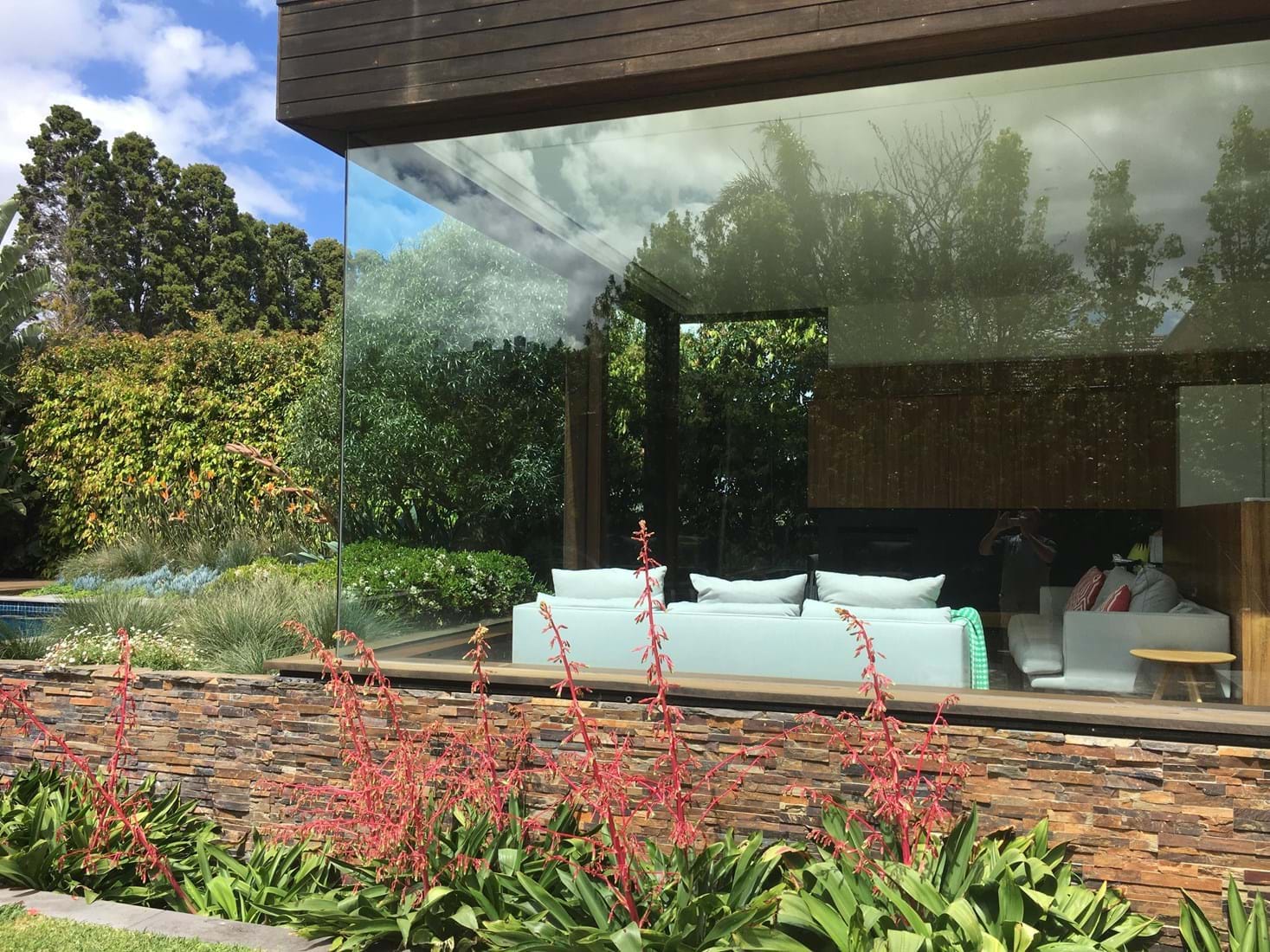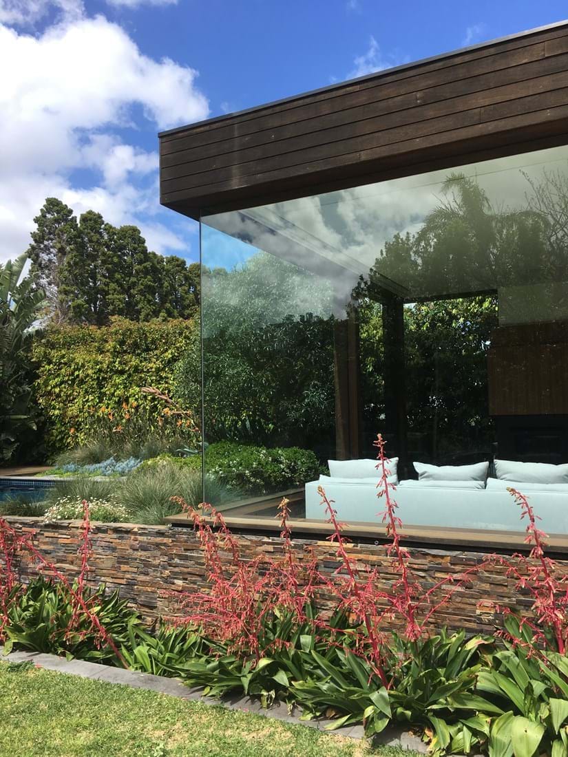 With a combination of glass, stone and timber material palette works well with the bold and hardy succulent and exotic planting palette. With striking orange and red flowers of architectural design within themselves. The contemporary outhouse is great for storage and change room.