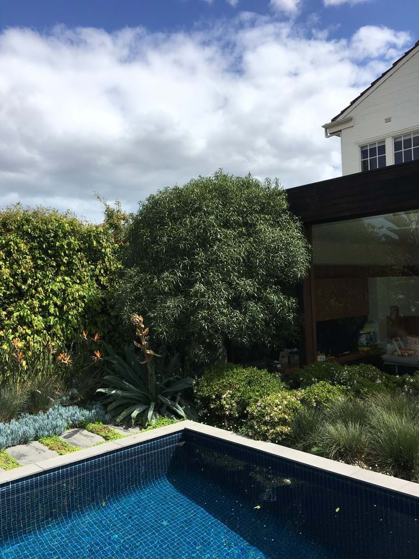 With this bold organic planting style and formal layout this garden certainly brings the outside in. The large windows create a continuous garden and pool theme as if looking into a mirror.